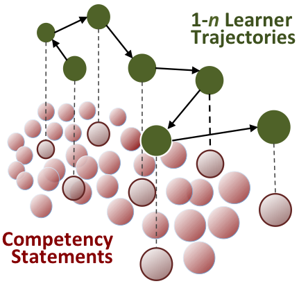 The named graphs for learning trajectories or pathways may be identified as formal curriculum structures or as personalized trajectories created by instructors or learners as evidence of progress. They may also function as suggested paths forward in the learning process or as guides to other instructors or learners in creating their own trajectories.