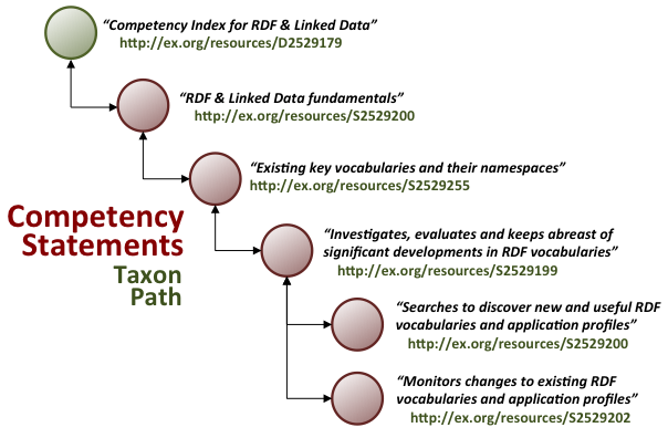 While the Index defines a set of competencies, it neither prescribes any competencies as “core” nor defines a logical sequencing of its components. In other words, the Index does not, in itself, define a curriculum by prescribing a single learning trajectory or pathway through the set of competencies expressed as nodes in the Index graph. The LD4PE project will customize existing tools to enable teachers, trainers, and learners to map their own pathways through the Index graph. These pathways can be saved as named graphs that traverse, or overlay, the competency nodes of the Index.